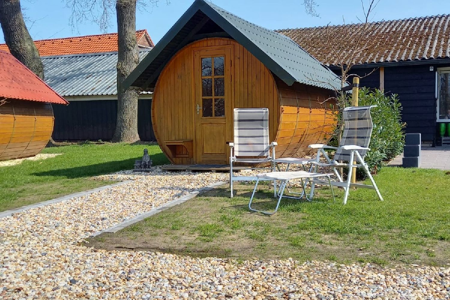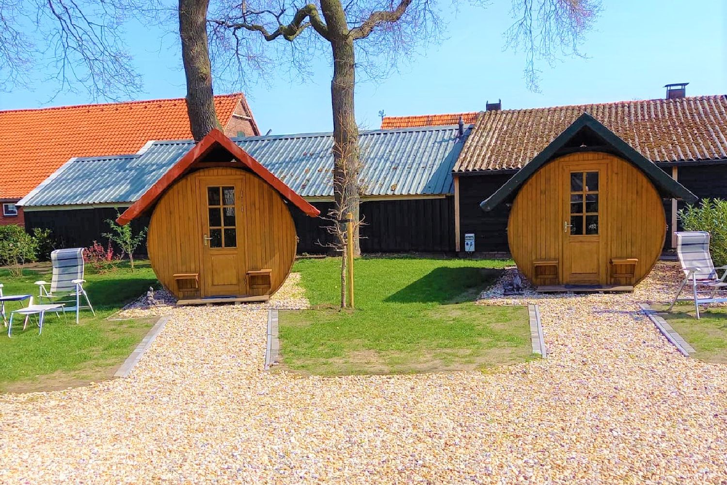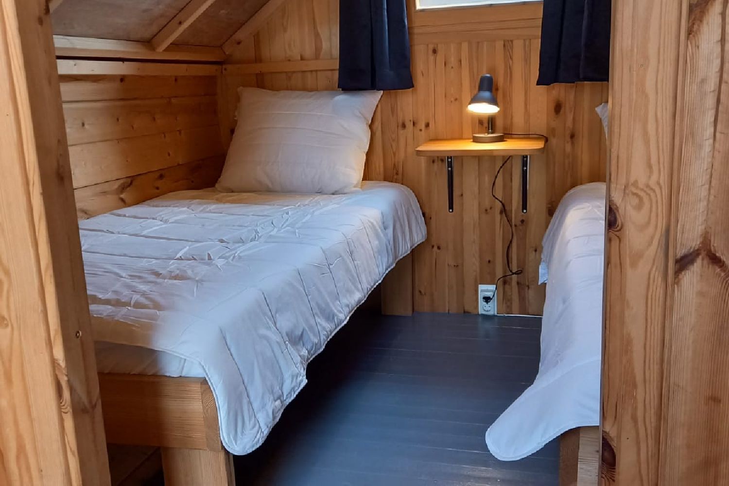 De hutten zijn voorzien van 2 1-persoons bedden, tafeltje en 2 terrasstoelen.